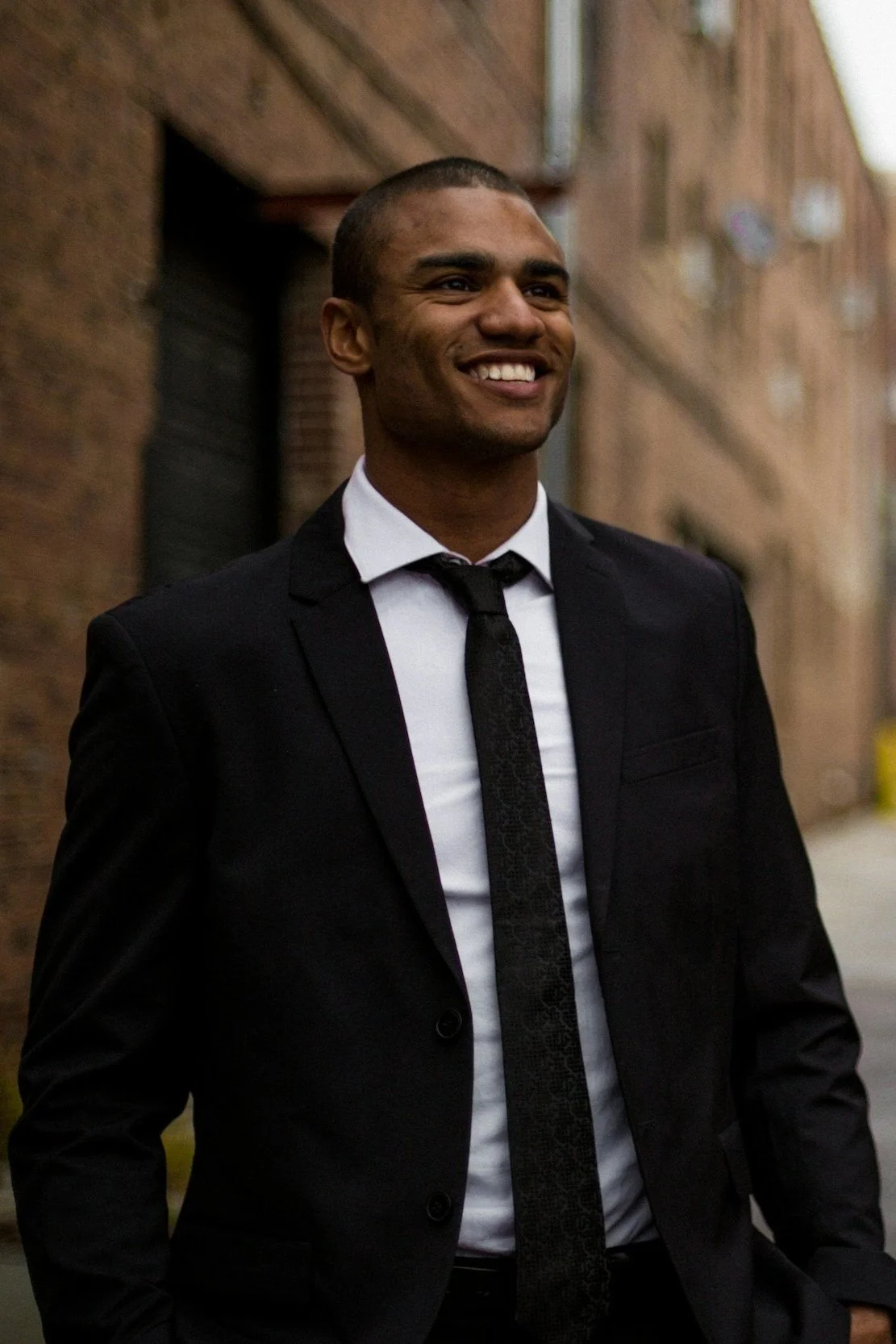 Man in a suit smiling outdoors near brick building